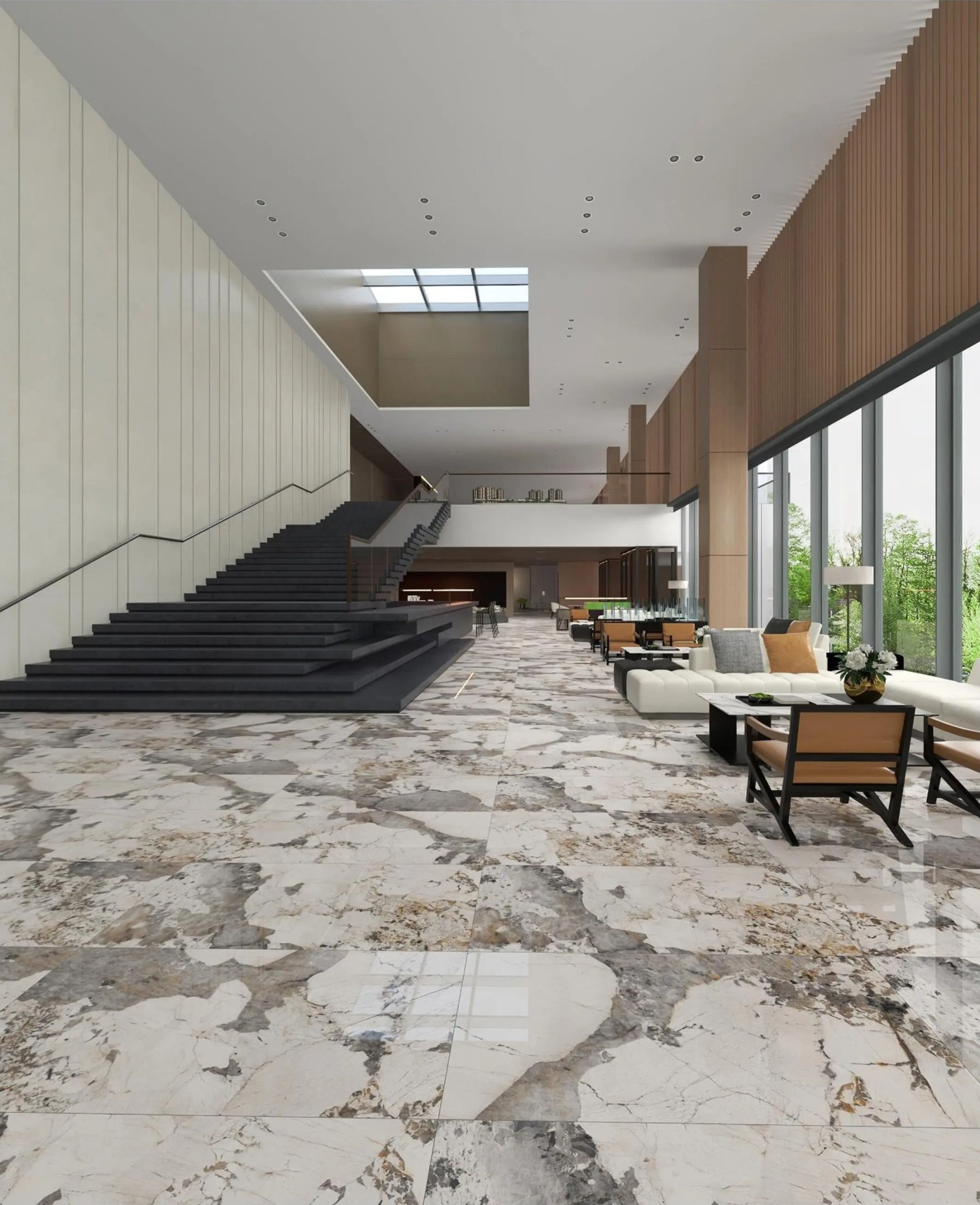 75x150cm Marble tile (full body) กระเบื้องปูพื้นพอร์ซเลนนี้มี ฉนวนกันความร้อน ต้านเชื้อแบคทีเรีย คราบสกปรก และทำความสะอาดง่าย แรงบันดาลใจจากหินธรรมชาติ กระเบื้องนี้มีพื้นผิวหินอ่อนเหมือนจริงเพื่อสร้างความสวยงามและความ หรูหราให้กับพื้นที่ ซึ่งได้รับการนิยมใช้กันอย่างแพร่หลายในเชิงพาณิชย์หรือตกแต่งบ้าน