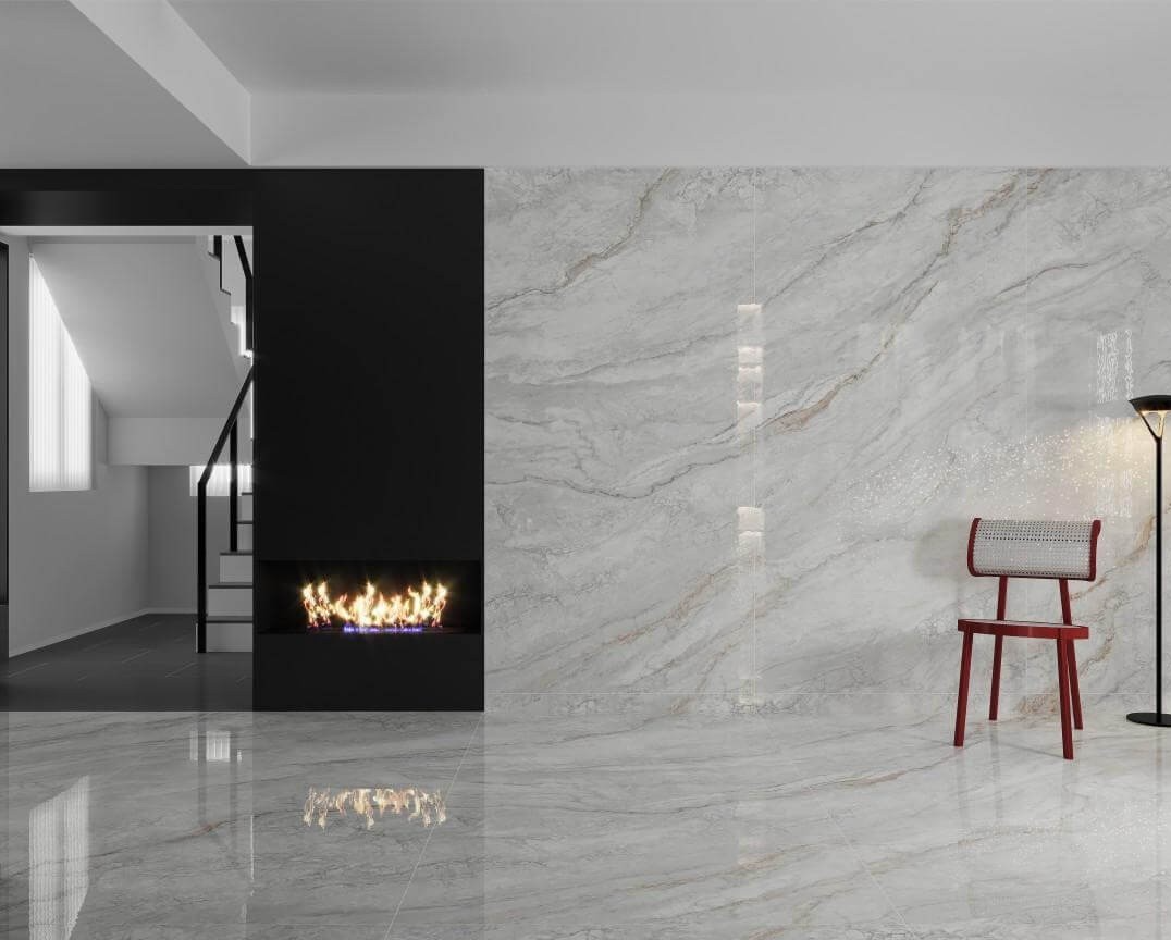 กระเบื้องลายหินอ่อนสีเทาลายต่อเนื่อง 120x240cm. ผิวเงา